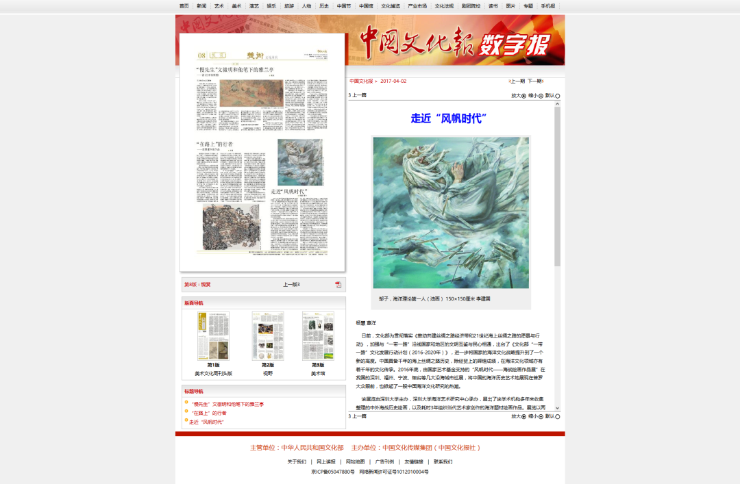 2016年底,一场由国家艺术基金支持的大型中国海洋历史为主题的《海上丝绸之路两千年》美术作品展,悄然在国内四大沿海城市——烟台、福州、宁波、深圳展出;2018年金秋时节,这项展览走进欧洲,陆续在塞浦路斯、比利时、荷兰、德国展出。在国内外掀起了一股中国海洋文化风潮,将中国的海洋历史以艺术的方式呈现在了世人眼前。