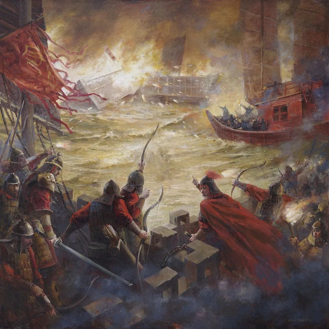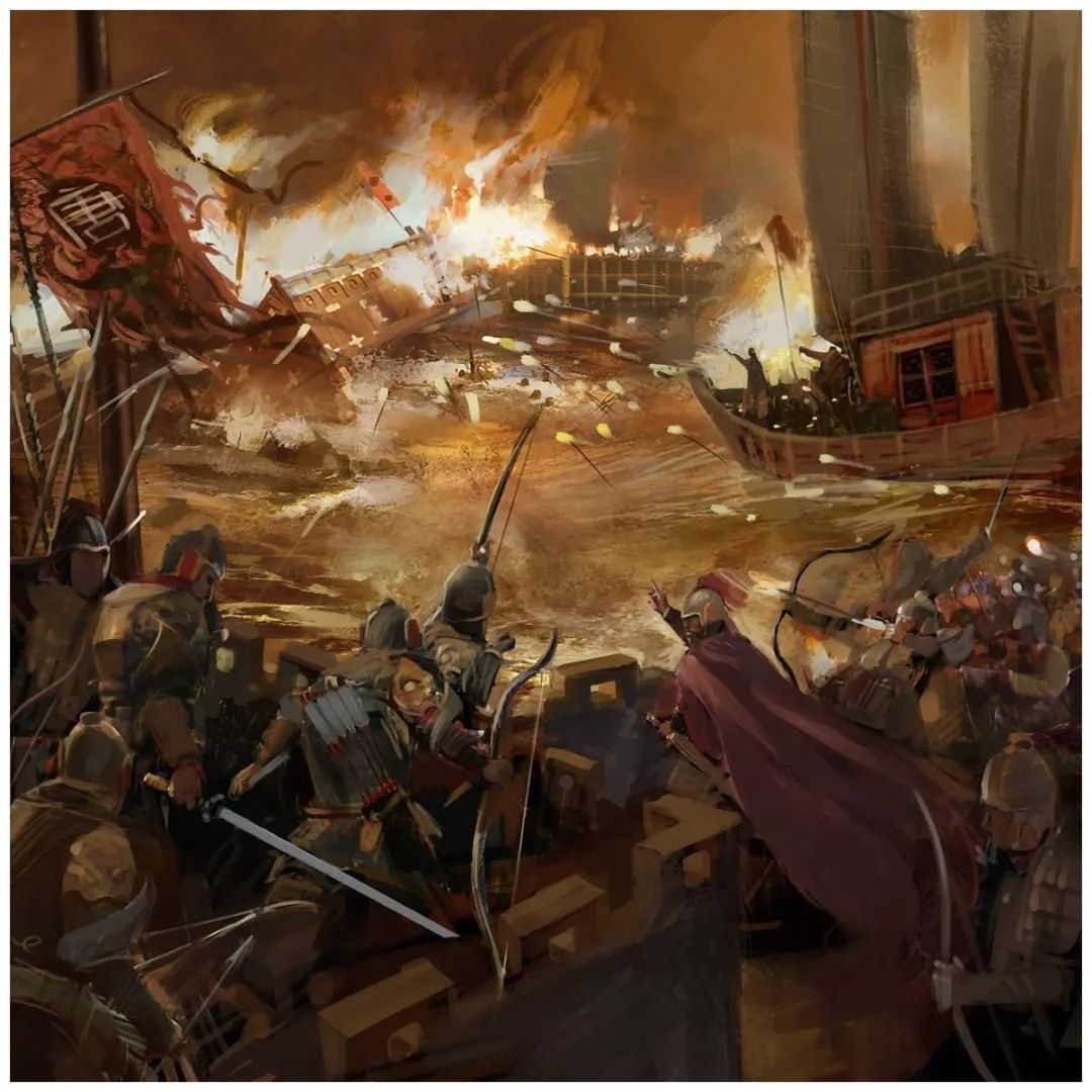 王永老师对于这幅作品的创作构思是大将刘仁轨在指挥作战时的英勇和唐朝水军士兵的无畏。画面内容是时年六十三岁的刘仁轨在隋唐时期典型的五牙战船上指挥唐军将士引弓发射带火箭矢攻击倭国战船的场景。采用俯视的全景视角,重点刻画一组战斗瞬间,唐朝水军将士服饰兵器都顺带得以展示。利用火把,硝烟,烈火,海浪,旗幡,规划好画面的黑白灰关系和节奏,同时也可营造恢弘激烈的海战氛围。无意间形成的三角形构图旨在强化海面战斗的不稳定感和动势。