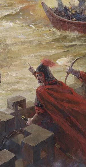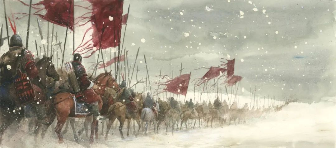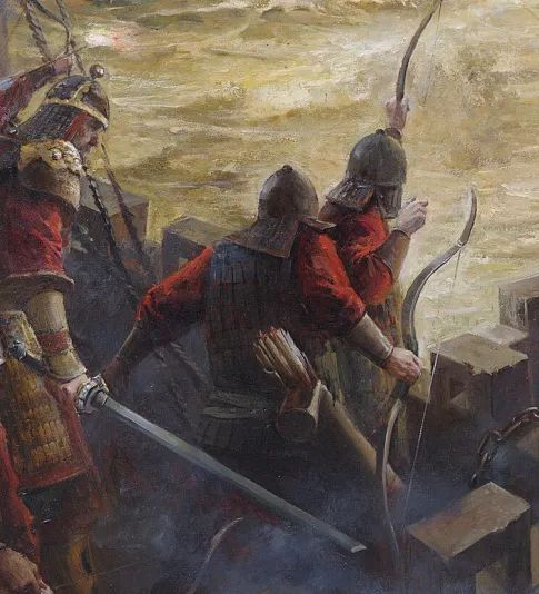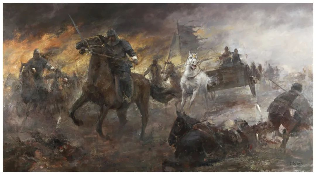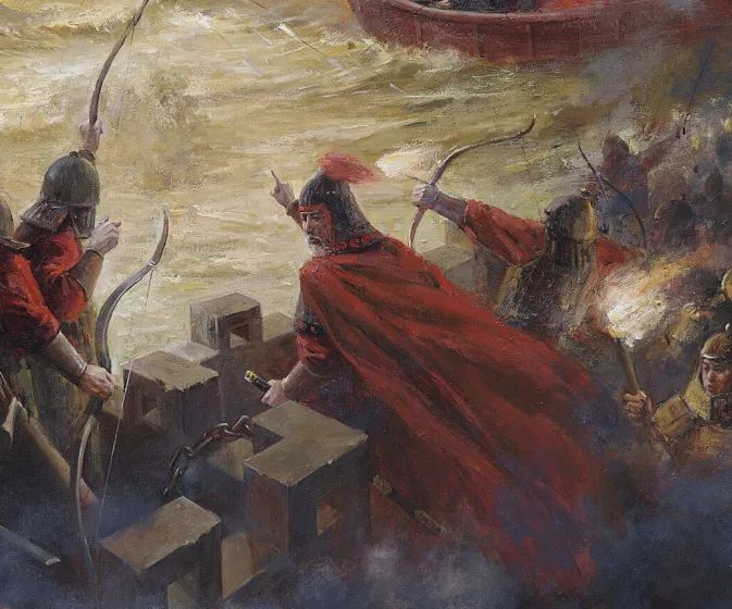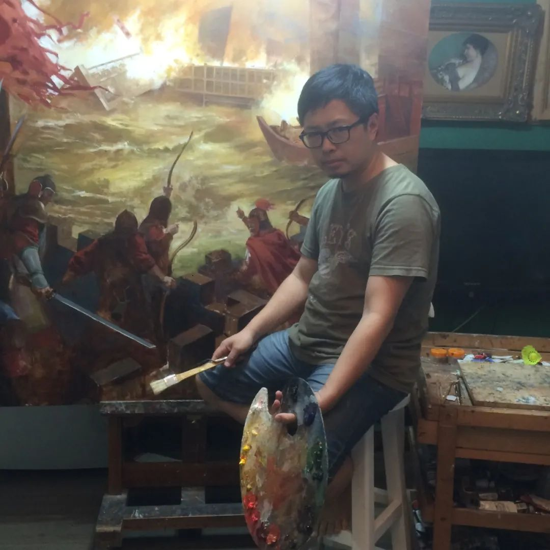与沈红泉老师创作的《白江口大战前夕》相呼应,画家王永老师创作的这幅油画《白江口四战倭兵》,则表现了战争开启时紧张和雄壮,两幅作品动、静之间,完整的表现出这一影响深远的历史事件。