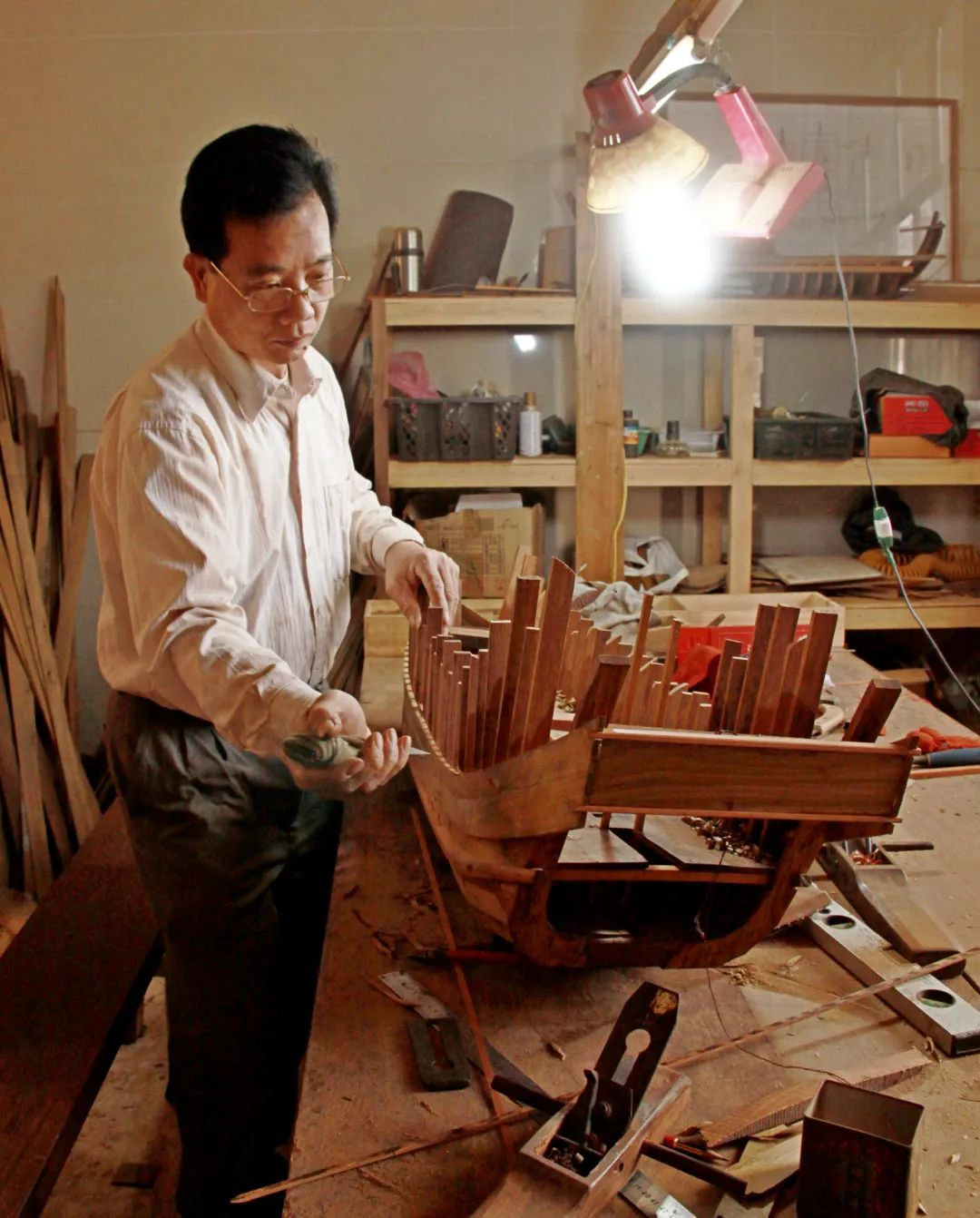 上世纪八九十年代,随着机器船、钢壳船的出现,传统造船业没落,木帆船渐渐消声匿迹,蔡数也经历了船厂改制到解体。1990年,为了生计,他选择弃船从商。辗转十年,心中始终放不下船,最终还是回到闸坡,做起船模。谈起初衷,他说:“船仿佛就是我这一辈子的归宿。在内心深处,它呼唤着我捡起它,捡起即将消失的传统技艺。”