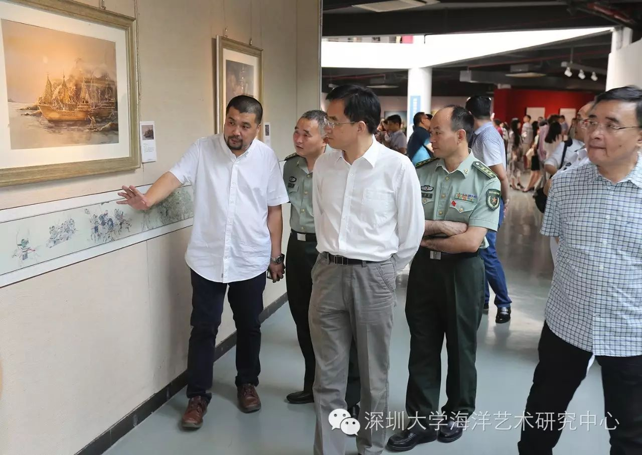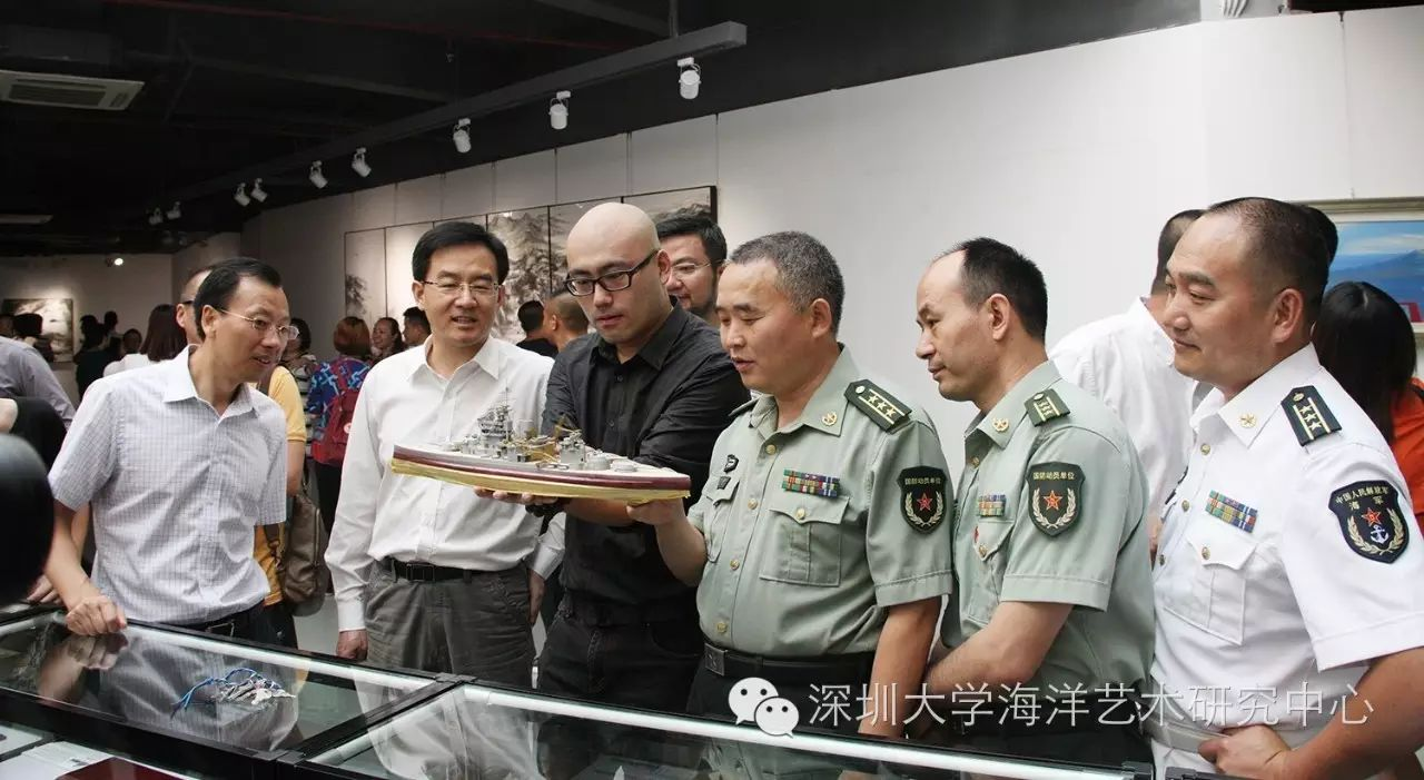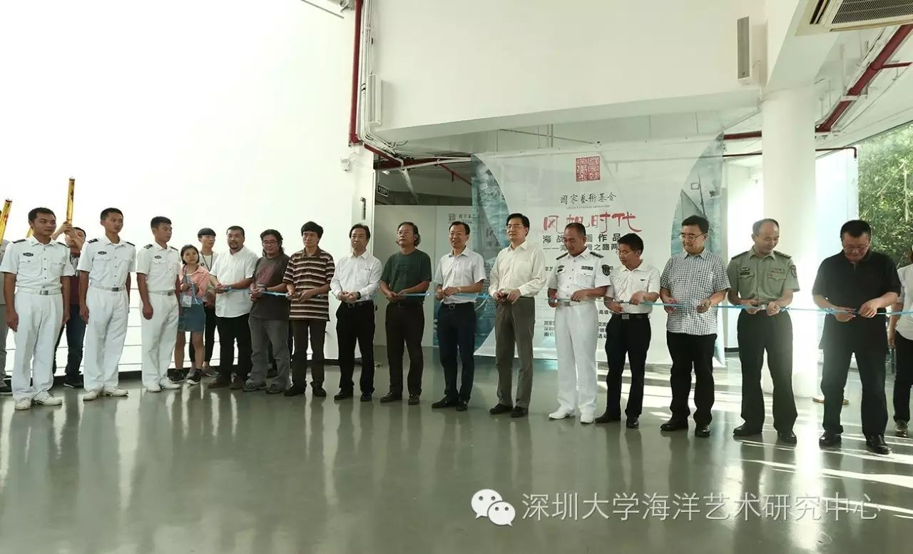 出席开幕式并为开幕式剪彩的嘉宾有:海军92619部队副政治委员、上校张奇志,深圳市文联党组书记李瑞琦,深圳市宣传部党委副书记、纪检书记沈忠生,深圳市文联副主席、深圳市美术家协会副主席于长江,深圳大学副校长李凤亮,深圳市文体旅游局艺术处处长张晋文,深圳大学师范学院院长钟曦,深圳市美协副主席、国画艺委会主任潘喜良,深圳市美协副主席、油画艺委会主任陈向兵,深圳市南山区教育局局长刘根平,深圳市宝安区宣传部副部长白政瑜,深圳市南山区人武部部长余富荣,深圳市宝安区人武部部长李金宇,深圳市福田区教育局副局长王玉玺,深圳市光明新区美术家协会主席张明亮,深圳大学海洋艺术研究中心主任张岩鑫等。