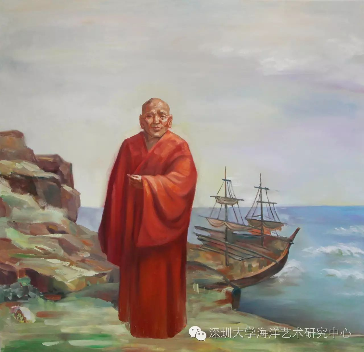 《鉴真七闯东海日本传法 之 风浪沉船》作者:叶育山,150×150cm,油画