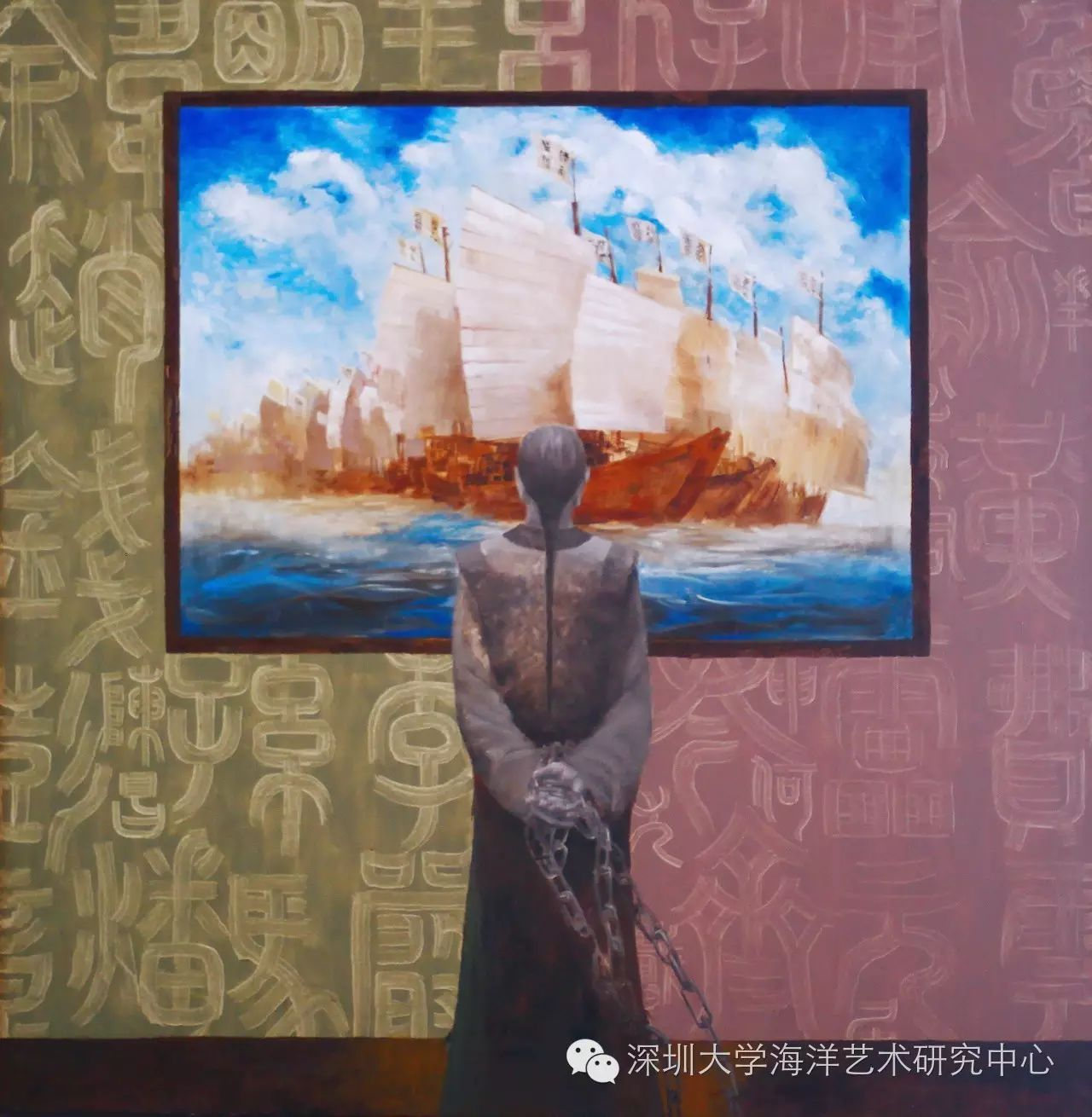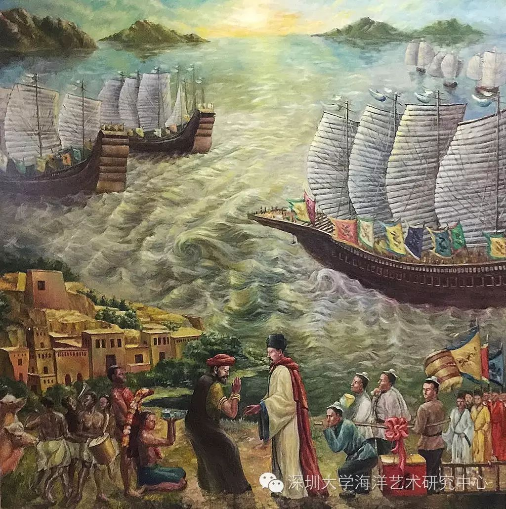 《航行中的郑和船队》作者:张嘉壎,尺寸:150×150cm,油画