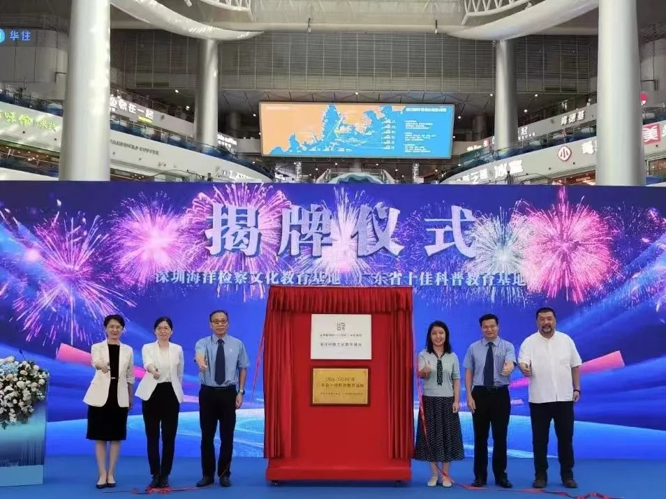2024年11月1日下午,在深圳海洋检察文化节开幕仪式上,广东省科学技术协会三级调研员冯娟女士、深圳市人民检察院副检察长吴澍农先生、深圳前海蛇口自贸区人民检察院检察长杨时敏先生、深圳大学艺术学部党委副书记汪渝女士、深圳招商蛇口国际邮轮母港有限公司副总经理刘姸姿女士、深圳大学海洋艺术研究中心主任张岩鑫教授正式为“深圳海洋检察文化教育基地”正式揭牌,标志着双方在海洋文化教育与法治建设领域合作的正式启动。