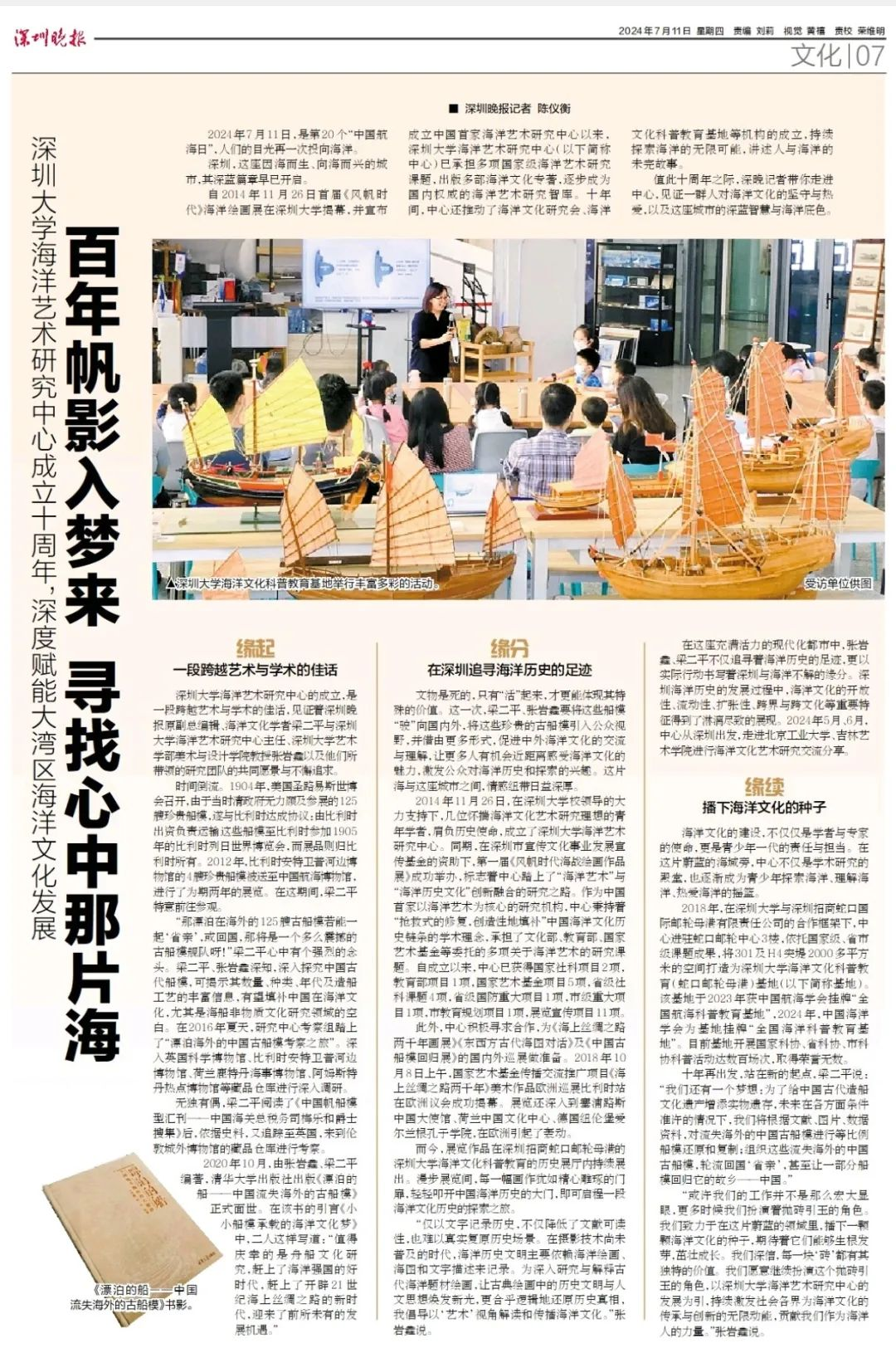 适逢7月11日中国航海日,深圳晚报整版报道了已有10年发展历程的深圳大学海洋艺术研究中心,立足深圳、面向全国、走向世界的10年心路发展以及未来憧憬。