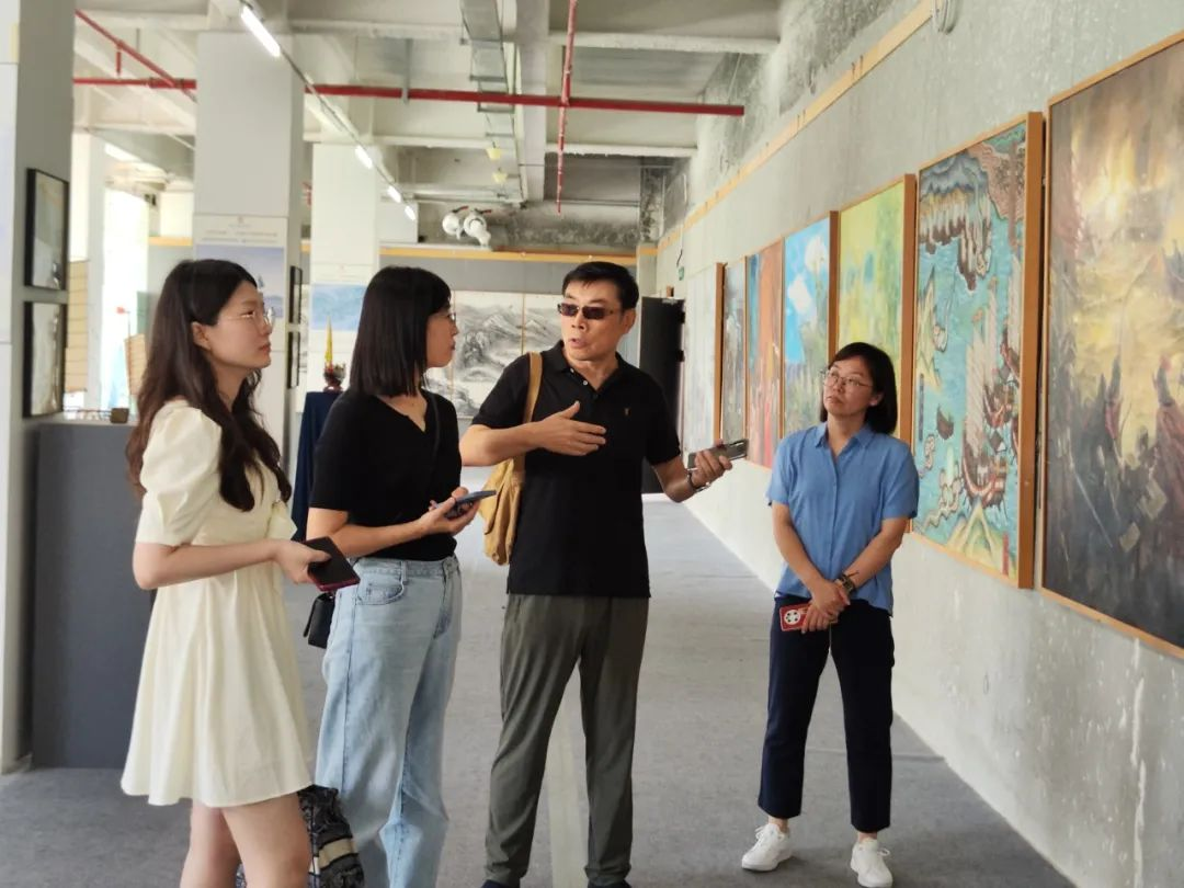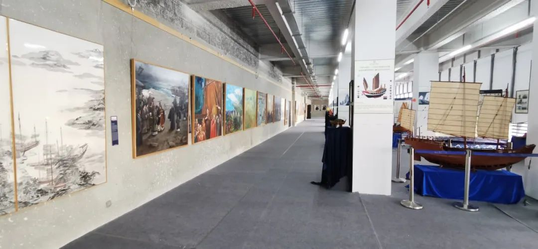 而今,展览作品在深圳招商蛇口邮轮母港的深圳大学海洋文化科普教育的历史展厅内持续展出。漫步展览间,每一幅画作犹如精心雕琢的门扉,轻轻叩开中国海洋历史的大门,即可启程一段海洋文化历史的探索之旅。画作或色彩斑斓或线条流畅,皆承载着独特情感与故事。柔和灯光下,细节毕现,引人驻足。辽阔海洋、热闹码头、繁华城市,经艺术家视角重塑,赋予了全新感受。展览开篇即聚焦中国古代海洋理论先驱邹子,跨越战国至现代中国,以海上丝绸之路与中国航海人物事件为核心创作题材,以民族文明叙事为骨干,鉴真东渡、郑和出海、周达观出使、海商张元隆……似随时跨出画布,与人共语。历史迷蒙烟雨已散,海洋风流人物依次亮相,两千余年的时间跨度,地域纵深感自东瀛延伸至地中海,时空交织,尽显磅礴气质。