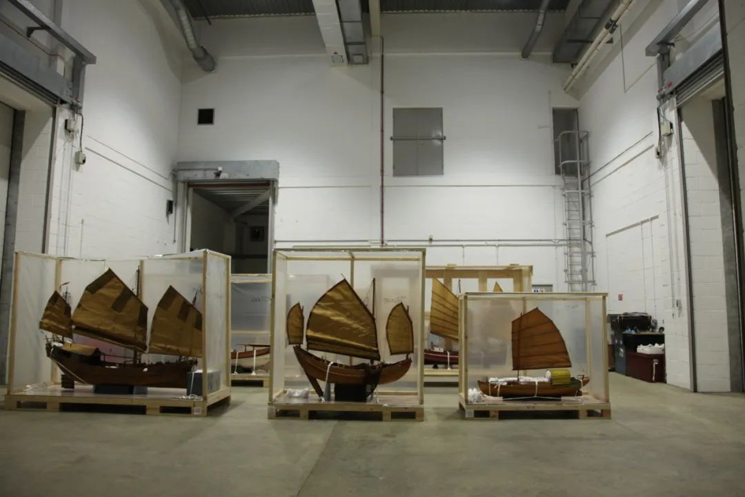 “那天是周二,实际上收藏品仓库每周仅周五对业内人士开放。”梁二平回忆道。藏品仓库位于伦敦郊外,面积堪比几个飞机库,在门卫拍照并核验证件后,众人被领入巨大的洞库。随着馆员按下按钮,卷帘门缓缓升起,灯光骤亮,眼前展现的是三排整齐排列的中国古船模。原来,工作人员已提前数日,从高高的藏品架上将这些船模一艘艘取下,在此空房间精心布置。