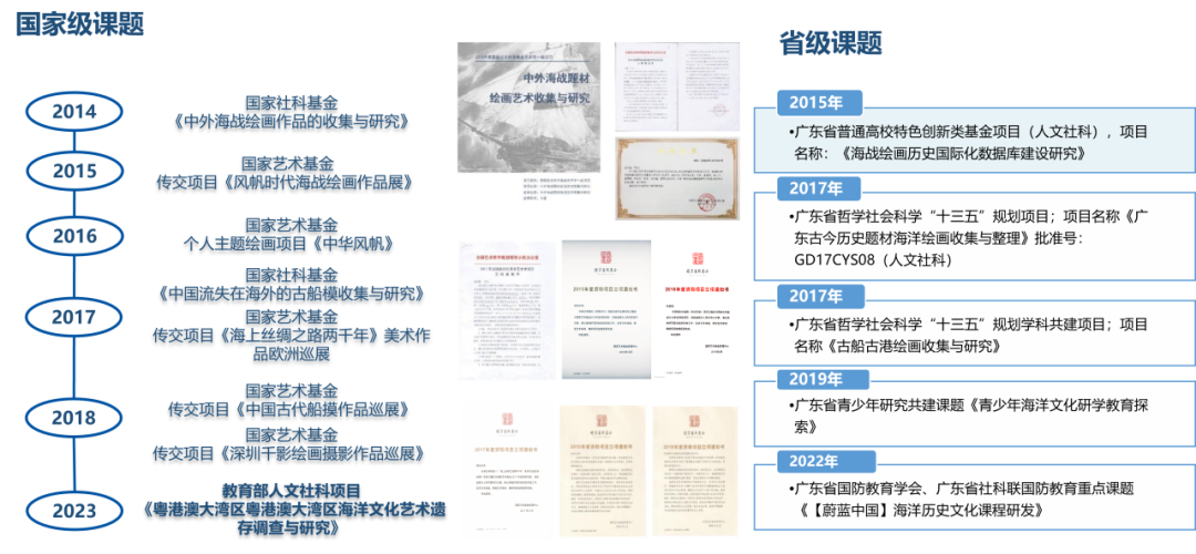 2014年11月26日,在深圳大学校领导的大力支持下,几位怀揣海洋文化艺术研究理想的青年学者,肩负历史使命,成立了深圳大学海洋艺术研究中心。同期,在深圳市宣传文化事业发展宣传基金的资助下,第一届《风帆时代海战绘画作品展》成功举办,标志着中心踏上了“海洋艺术”与“海洋历史文化”创新融合的研究之路。作为中国首家以海洋艺术为核心的研究机构,中心秉持着“抢救式的修复,创造性的填补”中国海洋文化历史链条的学术理念,承担了文化部、教育部、国家艺术基金等委托的多项关于海洋艺术的研究课题。自成立以来,中心矢志对中国的海洋绘画艺术进行梳理,通过古今海洋题材绘画的研究与解读,来弥补过去失去的并创造当今时代的海洋绘画艺术,拓宽中国海洋文化艺术研究的范式样本,填补中国在海洋艺术创作和历史文献上的多项空白,为国家海洋文化研究提供了珍贵文献和学术支持,为未来海洋战略研究提供历史借鉴,是我国在海洋艺术研究领域的重要科研机构,努力成为国民了解中外海洋文化的窗口,为我国海洋发展提供翔实的素材和坚固的后盾。自成立以来,中心已获得《中外海战题材绘画艺术收集与整理》《中国流失海外的古船模收集与研究》等国家社科项目2项,《粤港澳大湾区海洋文化艺术遗存调查与研究》教育部项目1项,《风帆时代海战绘画作品展》全国巡展、《中华风帆》、《海上丝绸之路两千年》美术作品欧洲巡展、《中国古代船模作品巡展》、《深圳千影绘画摄影作品巡展》等国家艺术基金项目5项,省级社科课题4项,省级国防重大1项,市级重大项目1项,市教育规划项目1项,市级展览宣传项目11项。