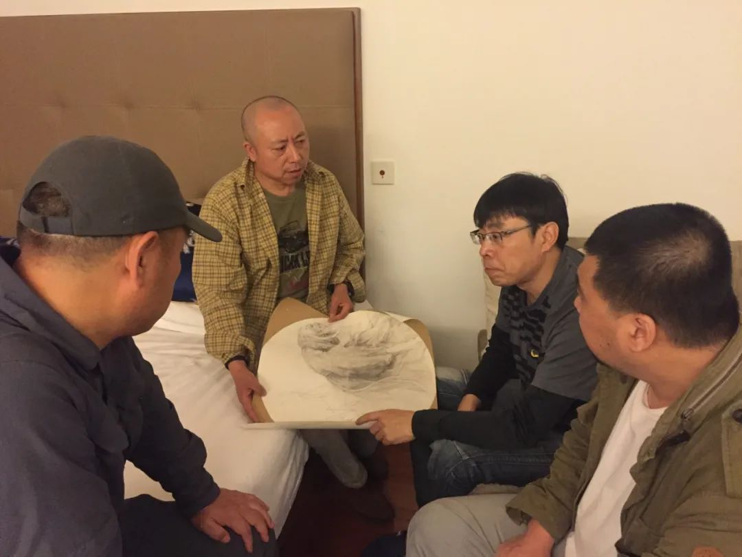 ▲梁二平、张岩鑫与“邹衍”的创作者李建国老师沟通小稿