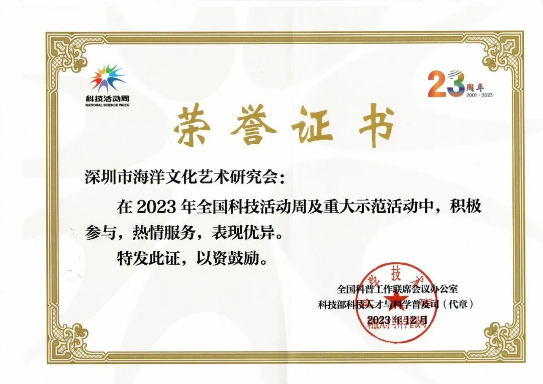 2023年基地充分发挥自身优势,面向社会各界普遍开展海洋文化科普教育活动100多场次。包括,在全国科技活动周期间、科普月期间开展特色活动,深度参与2023深圳国际海洋周海洋文化教育板块项目,得到极高评价。学习对象覆盖幼儿园、中小学、大中院校学生、残疾人以及社会多阶层,基地还积极联合涉海单位,如深圳海洋监测预报中心、广东海警、南山海事、应急救援等部门以及市区街道科协、妇联等开展联动教育活动,丰富基地海洋文化服务内容。2023年基地工作获得“2023年深圳市社会科学普及示范基地”称号、“2023年全国科技活动周及重大示范活动” 荣誉证书、“2023年度湾区邮轮最佳产品策划奖”“关爱孤独症儿童家庭爱心单位”等多项荣誉。未来基地还将踏实笃行,将海洋文化科普教育工作继续做深做实,努力成为深圳的海洋文化科普教育名片,为打造粤港澳大湾区海洋文化科普教育桥头堡基地,而不懈努力。