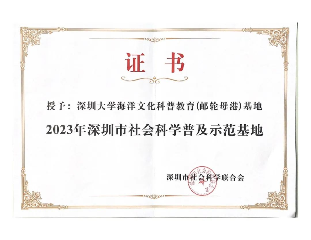 2018年,在深圳大学与深圳招商蛇口国际邮轮母港有限责任公司的合作框架下,中心进驻蛇口邮轮中心3楼,依托国家级、省市级课题成果,将301及H4突堤2000多平方米的空间打造为深圳大学海洋文化科普教育(蛇口邮轮母港)基地(以下简称“基地”)。该基地于2023年获中国航海学会挂牌“全国航海科普教育基地”,2024年,中国海洋学会为基地挂牌“全国海洋科普教育基地”,同时也是广东省科普教育基地、广东社会科学普及基地以及深圳市科普教育基地等。