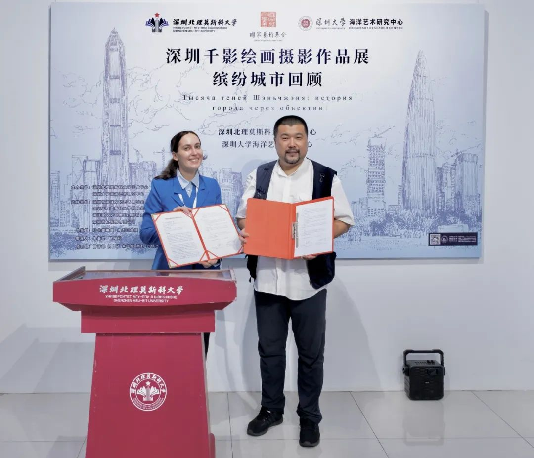 开幕仪式上,深圳大学海洋艺术研究中心主任张岩鑫与深圳北理莫斯科大学艺术中心主任叶卡捷琳娜 ·纳杰日金娜签署合作协议,为后续两中心的深度合作构建目标。合作将融合双方资源,共同探索中国与俄罗斯海洋文化的独特魅力,并推动双方在文化艺术领域的广泛交流。双方将共同挖掘两国海洋文化的历史底蕴和艺术价值,举办联合展览、艺术交流活动,以及开设文化交流课程,促进两国文化的交融与互鉴。