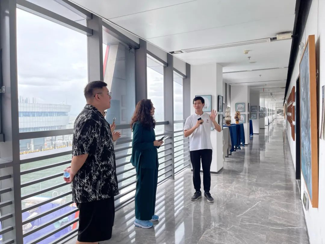 科普专员朱佳泉向深北莫艺术中心一行详细介绍了深圳大学海洋文化科普教育(蛇口邮轮母港)基地在海洋文化科普领域的发展状况。一行人参观了海洋艺术科学馆内展出的国家艺术基金项目《海上丝绸之路两千年》和《寻梦中国帆——中国古代船模展》的精美作品,了解到每一件展品背后承载着丰富的历史信息和文化内涵,感受展品所呈现出来的中国海洋历史脉络和中国古人的航海智慧。深北莫艺术中心主任叶卡捷琳娜·纳杰日金娜表示双方可以共同合作,推动中俄两国海洋文化的科普与交流。