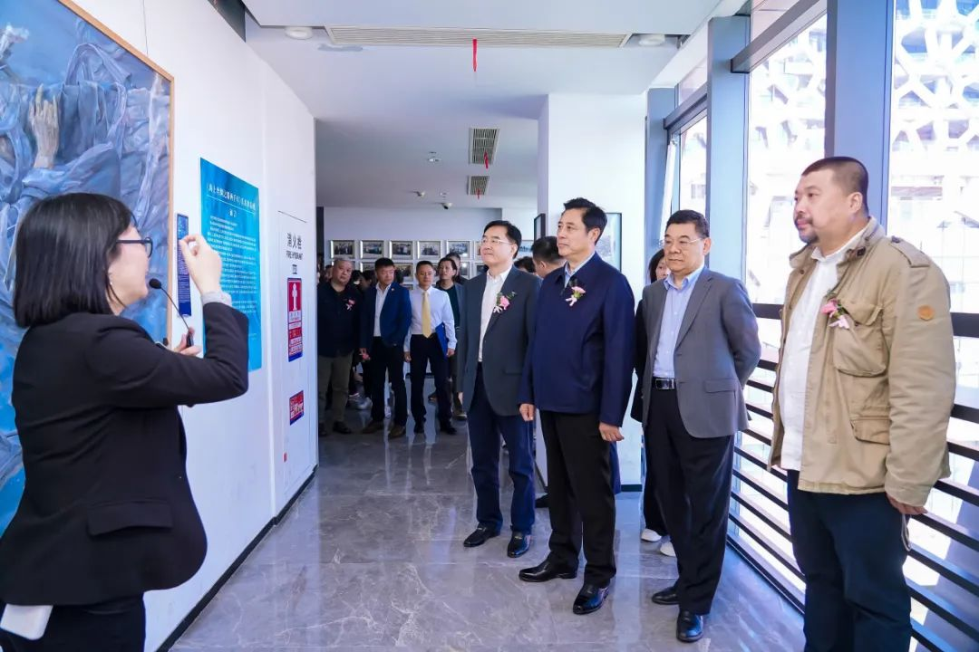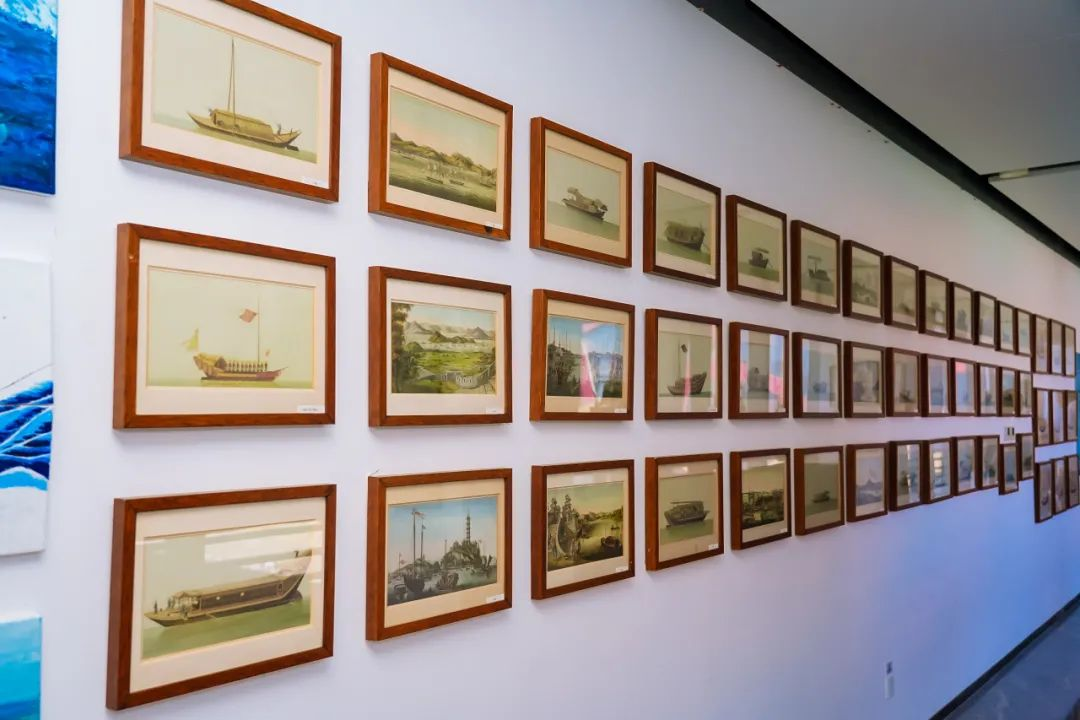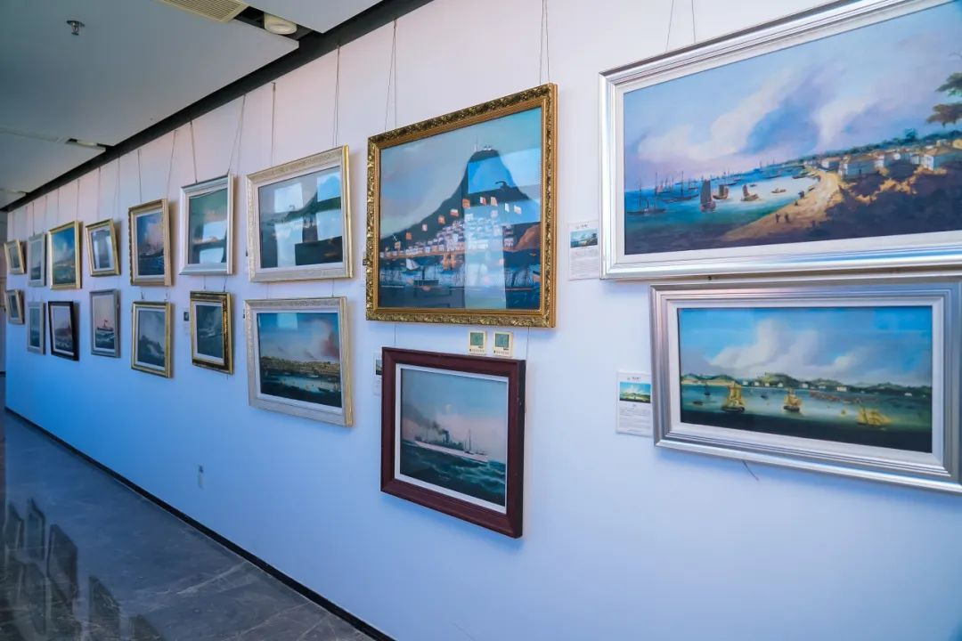 在进入突堤展厅的长廊上展陈出了第一届到第九届历年风帆时代的展览情况,当领导们走过长廊时纷纷驻足停留观看,无不感慨于这十年间发展的日新月异。走进主展厅,一幅幅波澜壮阔的海洋风景、形形色色的海洋人物画作呈现在我们的眼前,宛如在历史与现实中穿行,畅游于海洋的艺术殿堂。本次画展在以往画展作品的基础上,进一步邀请各领域艺术家作品参展。作品涉及自然风光、人文历史、现代海洋、海图、古船模等不同元素,展现新时代各领域艺术家们对于海洋文明的赞誉,用艺术赋能海洋,以艺术手段展现中国海洋历史的人文脉络,传播中国海洋发展状态及价值观。