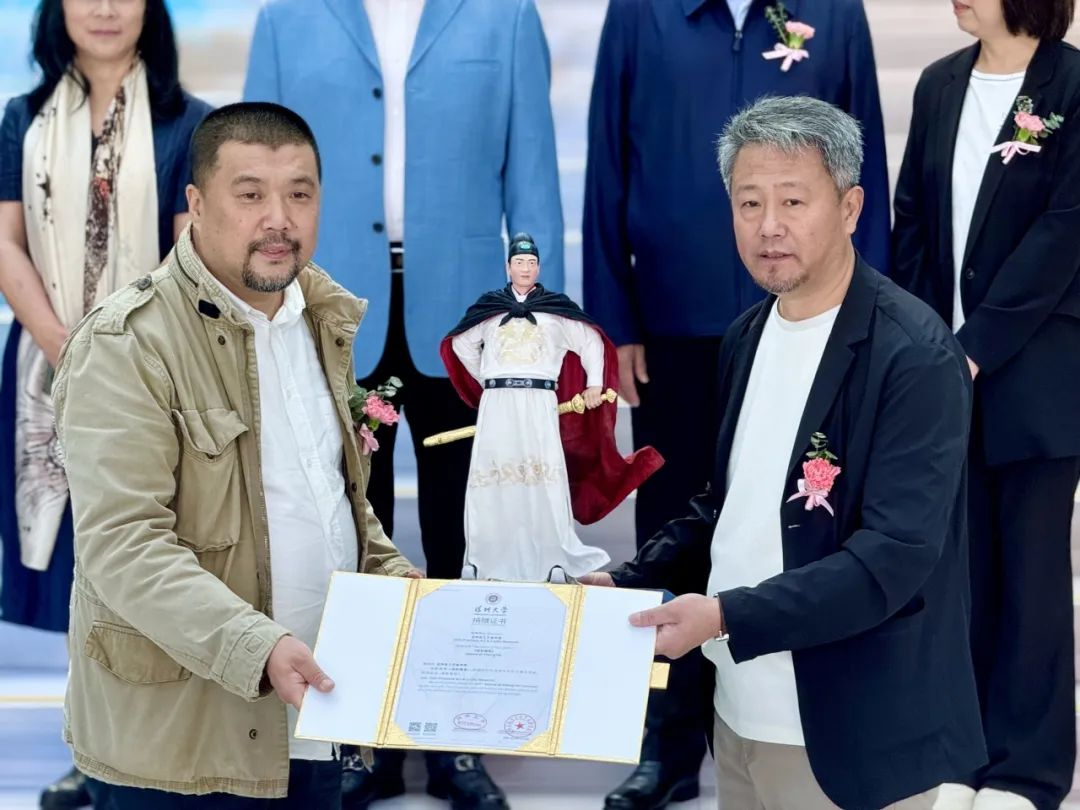 开幕仪式现场,中国工艺美术协会副会长、国家级工艺美术大师、吉林省民间工艺美术馆馆长冯宇平先生携一艘近4米长的郑和宝船复原模型重磅助力展览开幕。祝福十年新起点的深圳大学海洋艺术研究中心开启海洋文化艺术发展新征程!同时,冯馆长还向深圳大学海洋艺术研究中心捐赠其亲手制作的“郑和”雕像,寄予深圳大学海洋艺术研究中心的海洋文化艺术事业继续开辟时代新篇。