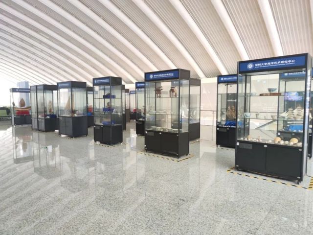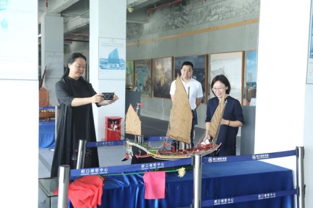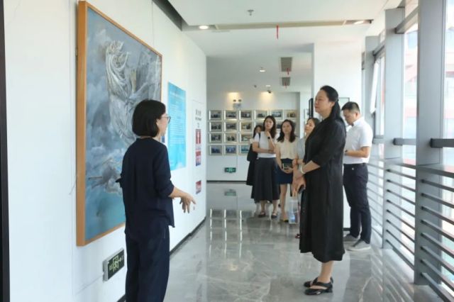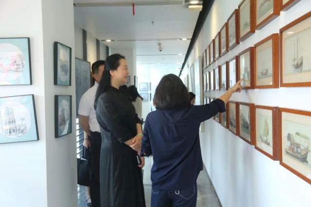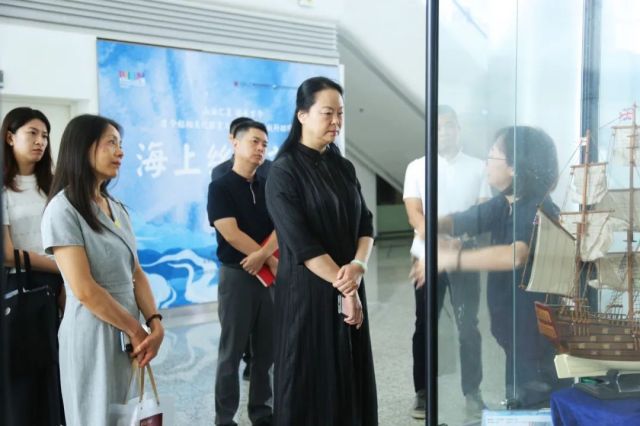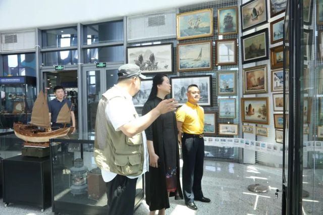 在深圳大学海洋艺术研究中心展览教育部主任、深圳市海洋文化艺术研究会秘书长葛洋的介绍下,福田区委宣传部一行重点考察了国家艺术基金项目“海上丝绸之路两千年”美术作品展、《寻梦中国帆——中国古代船模作品巡展》等海洋艺术展览,深入了解基地展区布局、展品特色与科普活动开展情况。在参观过程中,深圳大学海洋艺术研究中心成果在海洋文化育人、青少年海洋素养提升、粤港澳大湾区海洋文化资源整合等方面取得的成就,受到一致赞许。